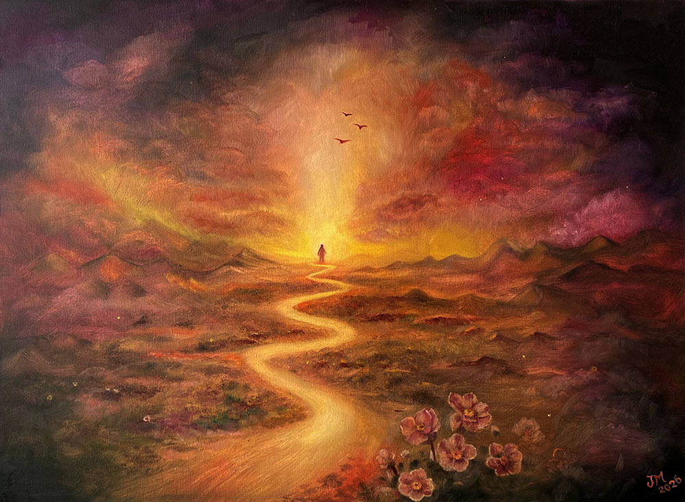 'Dit schilderij laat de weg van de veertigdagentijd zien. Geen snelle route, maar een weg met bochten. Een weg langs stille en donkere tijden, richting het licht aan de horizon. Toch is het licht niet alleen aan het einde, maar al aanwezig in de weg zelf.'